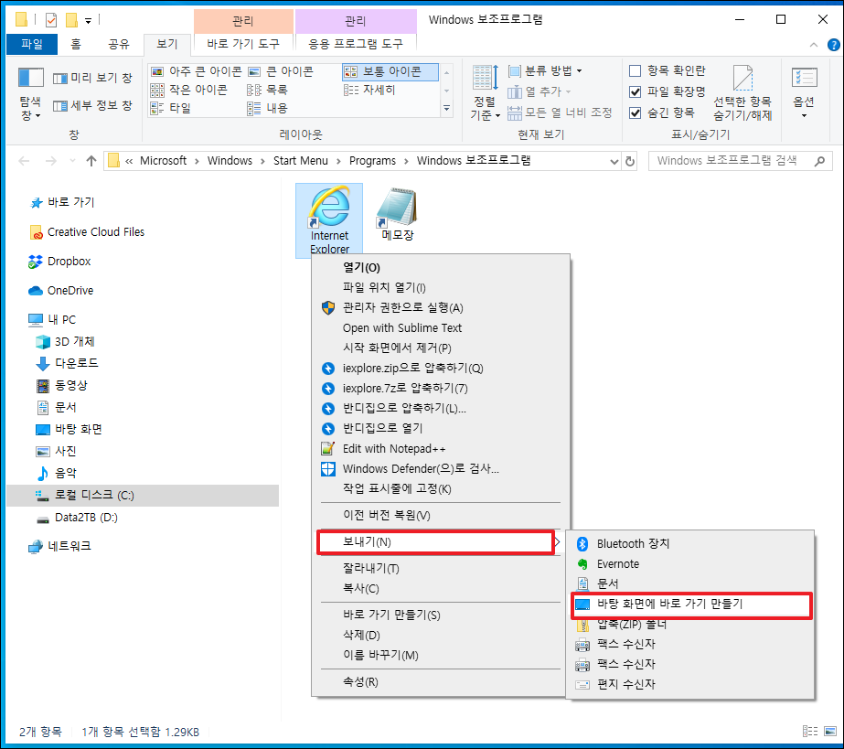 그러면 위와 같이 익스플로러 아이콘 모양이 표시된 폴더가 열립니다. 여기서 인터넷 익스플로러 아이콘을 선택한 후 오른쪽 마우스 버튼을 클릭합니다. 그리고 "보내기"를 선택하고 "바탕화면에 바로 가기 만들기"를 선택하면 됩니다.