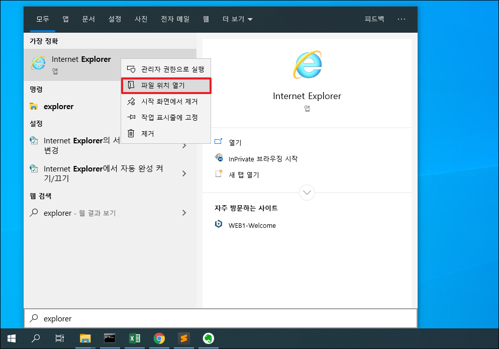 여기에서 "explorer"이라고 입력하면 위와 같이 바로 internet Explorer가 검색이 됩니다.