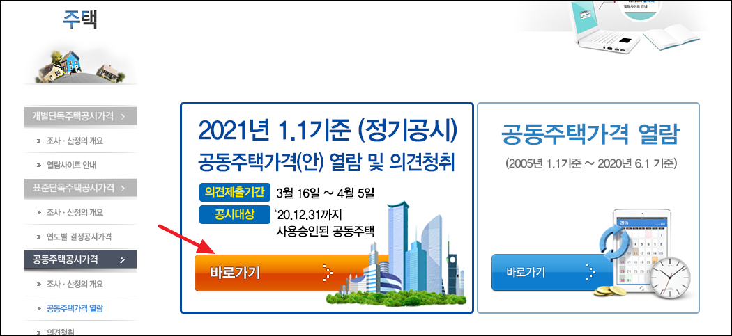 2021년 개별공시지가는 아직 확정된 상태가 아닙니다. 그래서 2021년 1.1기준(정기공시) 공동주택가격(안) 열람 및 의견청취라는 항목을 클릭합니다.